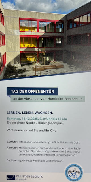 Unser diesjähriger Tag der offenen Tür findet am 13.12.2025 von 08:30 bis 13 Uhr statt. Weitere Informationen entnehmen Sie bitte dem nachfolgenden Flyer: