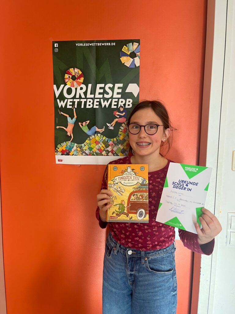 Matilda Lohmar aus der Klasse 6.1 gewann mit ihrer Präsentation aus „Abgefahren – Die Schule der magischen Tiere“ von Margit Auer knapp vor Jolina Schulz aus der Klasse 6.2 mit ihrem Beitrag aus „Kathas Katastrophen“ von Johanna Klement und Mareikje Vogler.